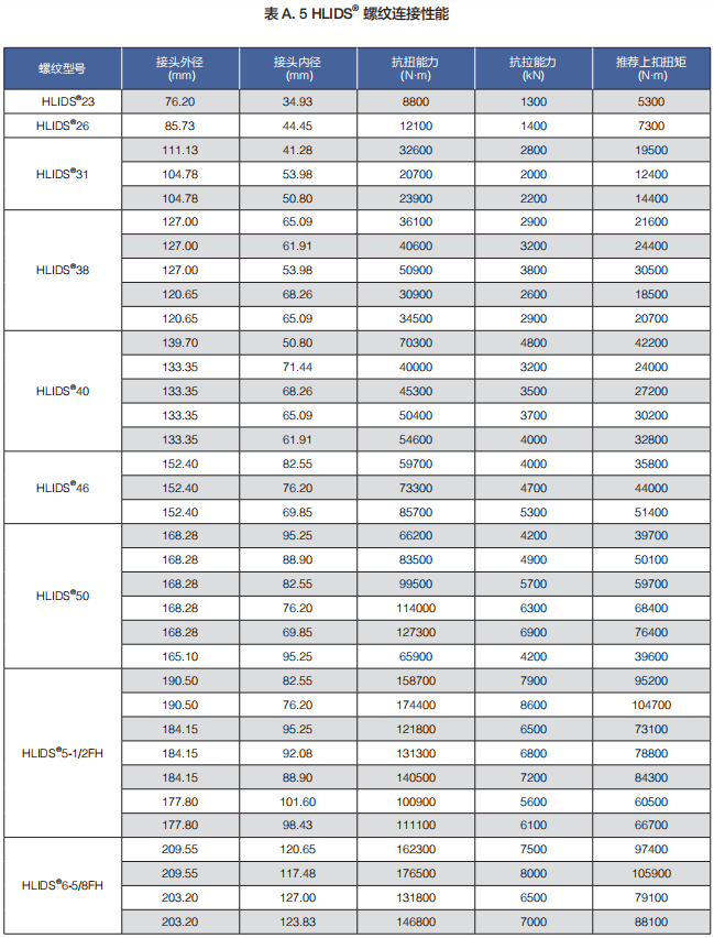 (a)HLIDS® 系列包括 HLIDS®23、HLIDS®26、HLIDS®31、HLIDS®38、HLIDS®40、HLIDS®46、HLIDS®50、HLIDS®5 1/2FH 和 HLIDS®6 5/8FH 等規(guī)格,適用于 2 3/8"-6 5/8" 所有API 標準鋼級和規(guī)格的鉆桿。